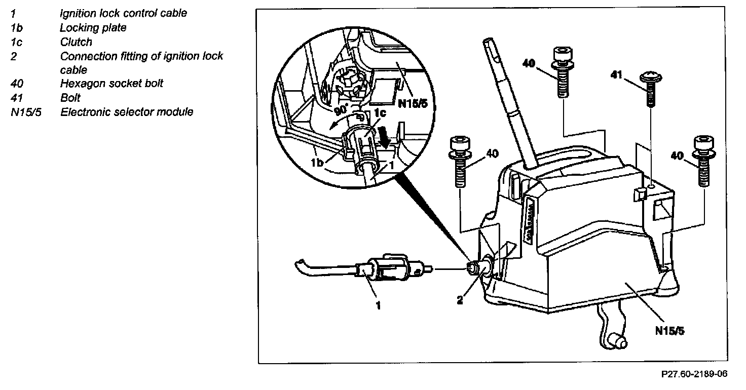 - Raise locking catch (1b) and push connector (1c) against force of spring into electronic selector lever module (N15/5), turn 90 degrees to the left or right and pull off ignition lock cable (1).