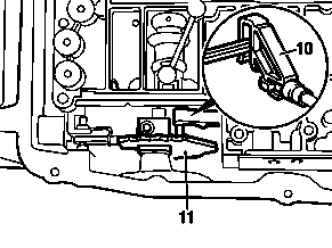 1 When inserting electrohydraulic control unit into transmission housing, plastic part of selector valve (10) must engage in driver of detent plate (11).