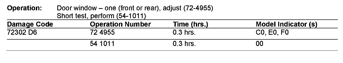 1. Check window guide - The dimension between the front and rear window guides (window frame) must be identical at the top and bottom and the door window must have a constant 1 mm of play (clearance) from top to bottom.