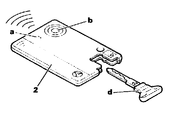 The spare key (2) is the size of a cheque card. The central locking and the ATA can be operated with the spare key. The drive authorization system can also be activated or deactivated via the infrared transmitter signal. The convenience feature cannot be operated. An infrared transmitter, a pushbutton (b) for operating, a light-emitting diode (a) to check the batteries, a battery compartment with two batteries (the same as in the standard transmitter key) and a manual main key (d) are located in the spare key (2). The infrared beam is emitted when the pushbutton (b) in the center of the front side of the spare key is operated.
