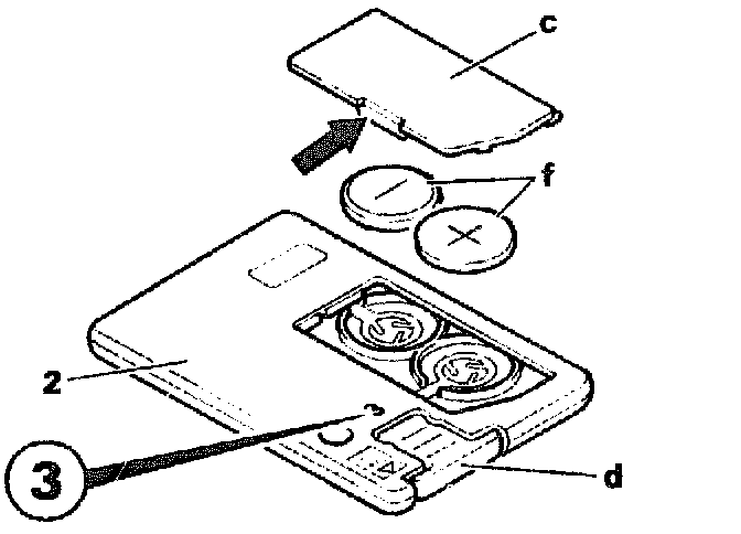 The battery compartment lid (c) must be removed from the spare key (2) to change the two batteries (f). To do this, press in the catch (arrow). The same two batteries are used as in the standard infrared transmitter key.