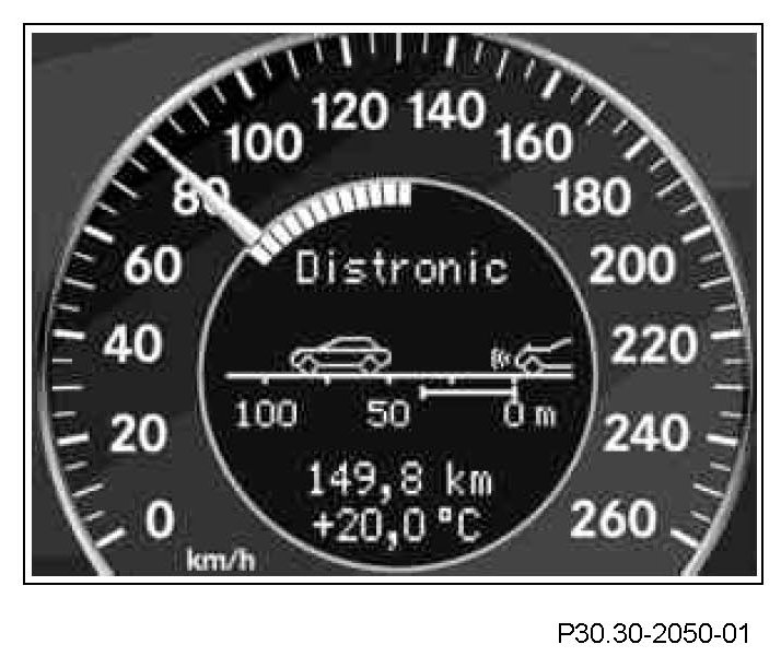 If the separation between the vehicles goes below the nominal separation the separation indicator lamp in instrument cluster lights up. In addition an intermittent signal (takeover signal) sounds. The distance warning lamp remains active even when the Distronic is off. The intermittent signal chime can be deactivated when the Distronic is switched off.