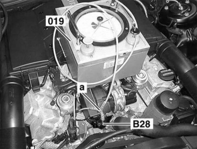 - Connect the vacuum tester to the input of component B28 (Pressure sensor) with the 3 x distributor.