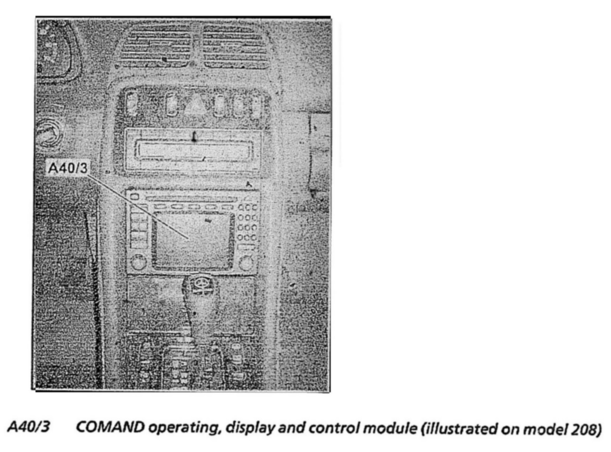 The COMAND operating, display and control module (A40/3) is the central component for the COMAND system. It has a video compatible LCD color display for output of information such as control menus, map data for navigation and television picture (in preparation). Control is possible with fixed function keys and two knobs as well as with menu guidance on the display.