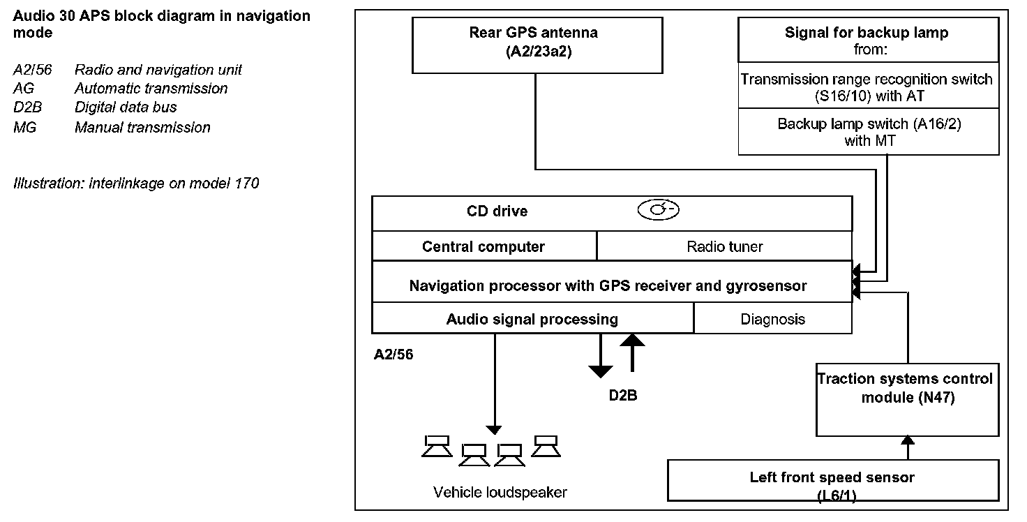 A navigation processor with CD-ROM drive is integrated into the radio and navigation unit (A2/56) for reading in the navigation data (digital map, speech segments and software).