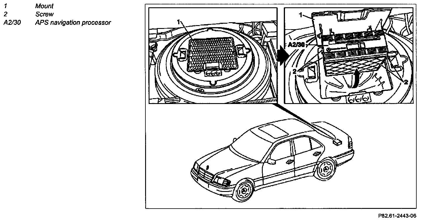 4 Remove mount (1) with APS navigation processor (A2/30) from spare wheel recess