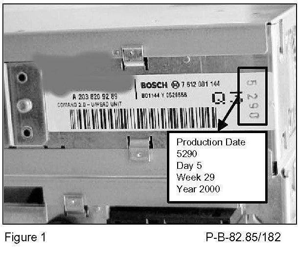 The above vehicles were fitted with a COMAND module with a production date between X41 0 and X490 (the first digit is not relevant). The date is stamped on the sticker above the connector block (refer to figure 1).