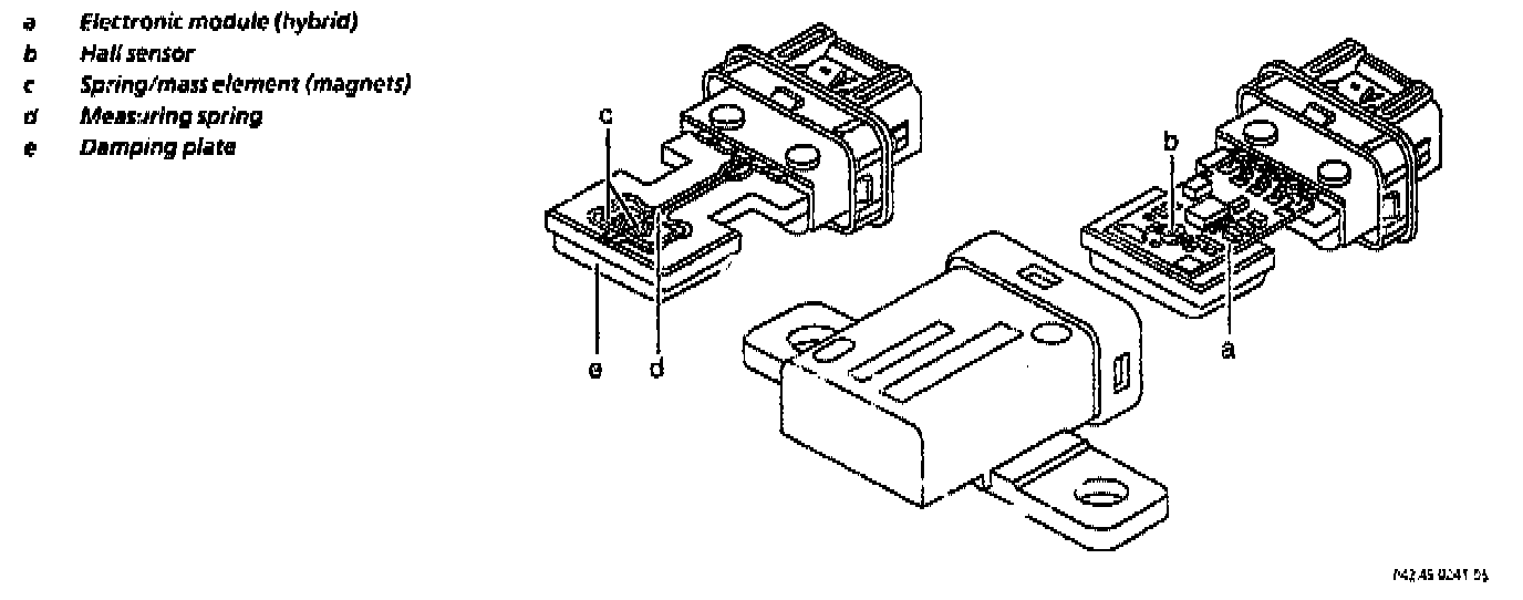 An electronic module (a) for recording signals is located in the acceleration sensor (B24/2). The measuring principle of the lateral acceleration sensor is based on a spring/mass system. A Hall sensor (b) is integrated in the electronic module. A spring/mass element (d, c) is located above it. The deflection of the spring/mass element above the Hall sensor (b) to the left or right results in formation of the signal.