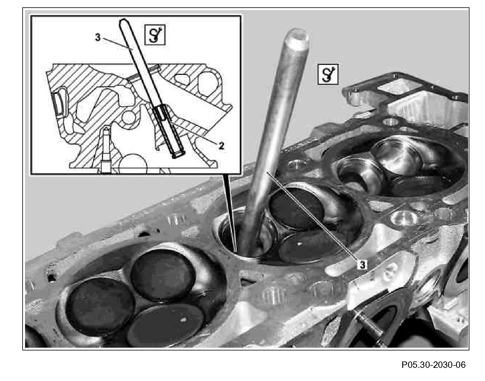 2 Knock out the valve guide (2) from the side of the combustion chamber using a drift (3).