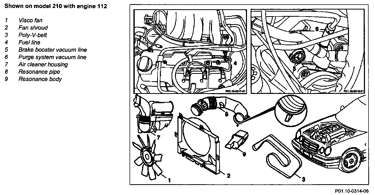 - On model 129, 202.093/033, 208.370/374/470 and 210.274/074 the air cleaner is integrated in the engine trim panel.