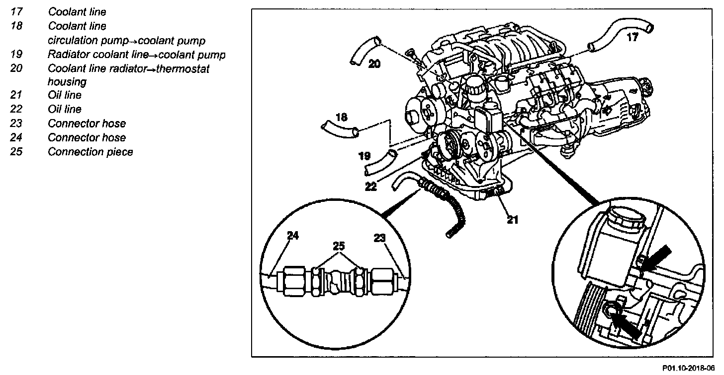 NOTE: On model 202.093/033 an additional coolant line is attached at the right cylinder head.
