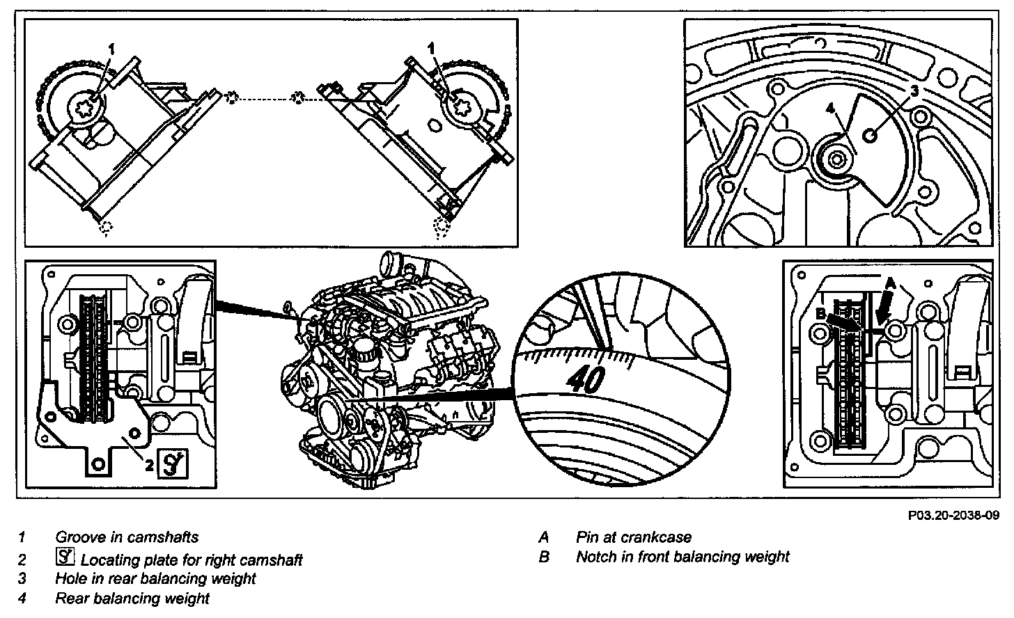 - The pin (A) and the notch (B) are visible at a depth of approx. 22 cm from the cylinder head separating surface through the left timing case recess.