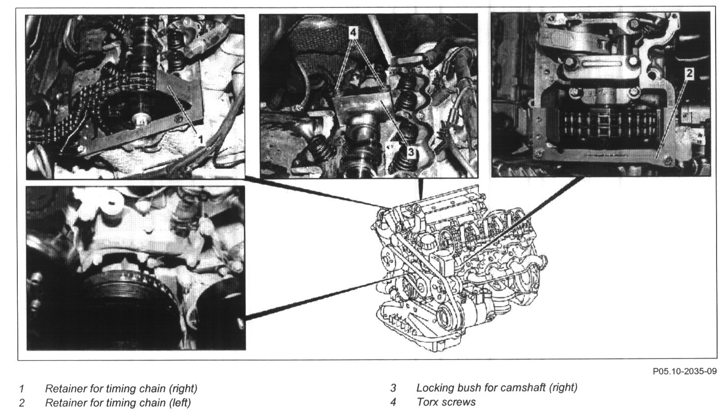 - Owing to the unevenly long paths of the timing chain it may be necessary to crank the engine as many as 14 times until the copper tabs are matched with the scribe marks on the camshaft sprockets. On vehicles equipped with an air pump, the combination valve must be unbolted before the right locking plate is inserted.