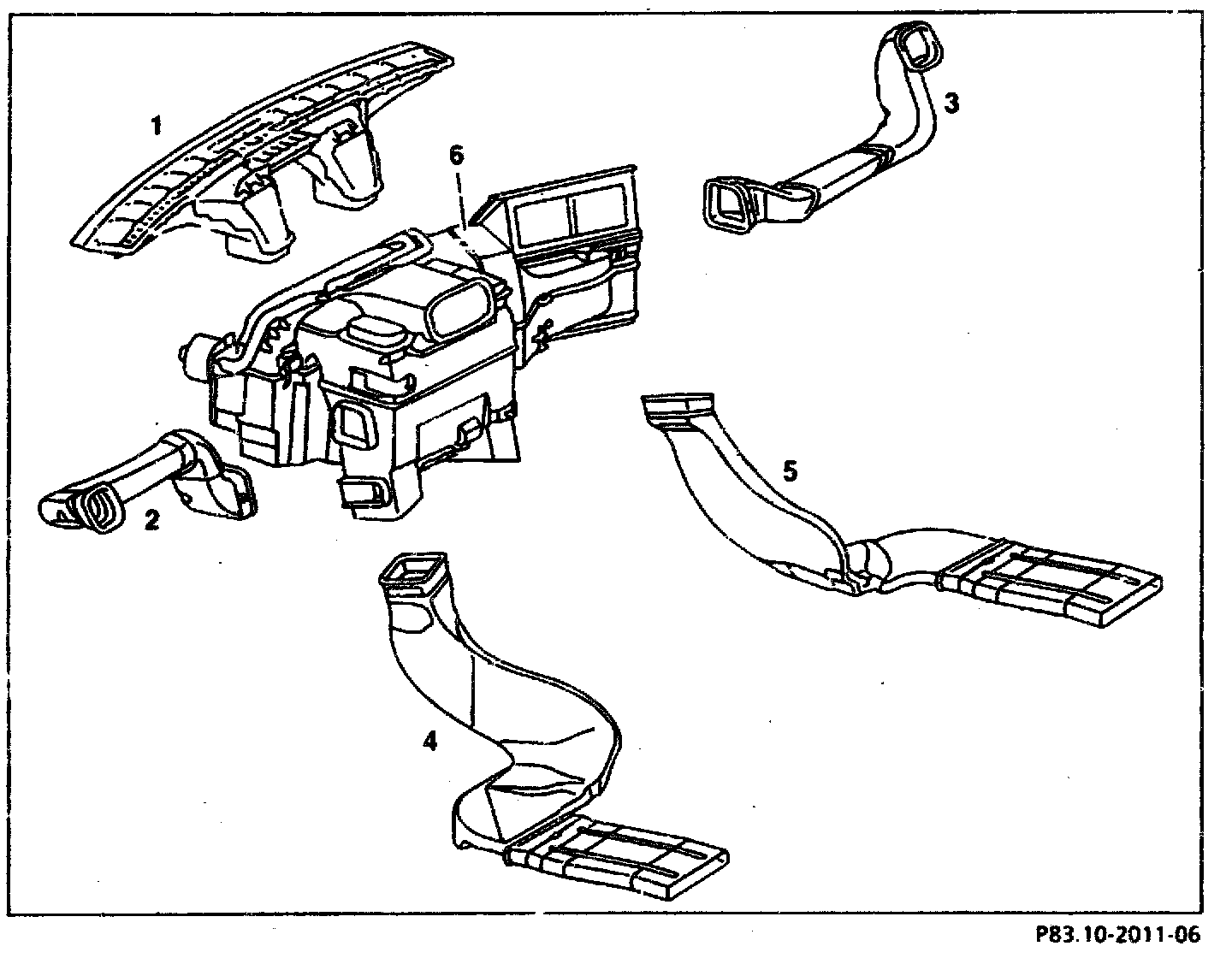 The defroster nozzle air duct (1) is located at the bottom of the windshield in the instrument panel.