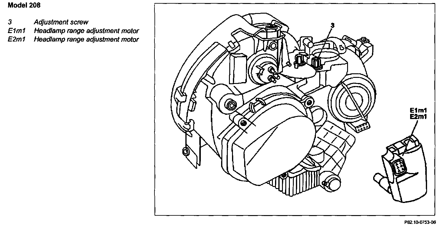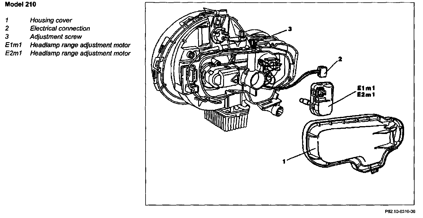 5 Turn adjustment screw (3) to left and remove headlamp range adjustment motor (E1m1, E2m1)