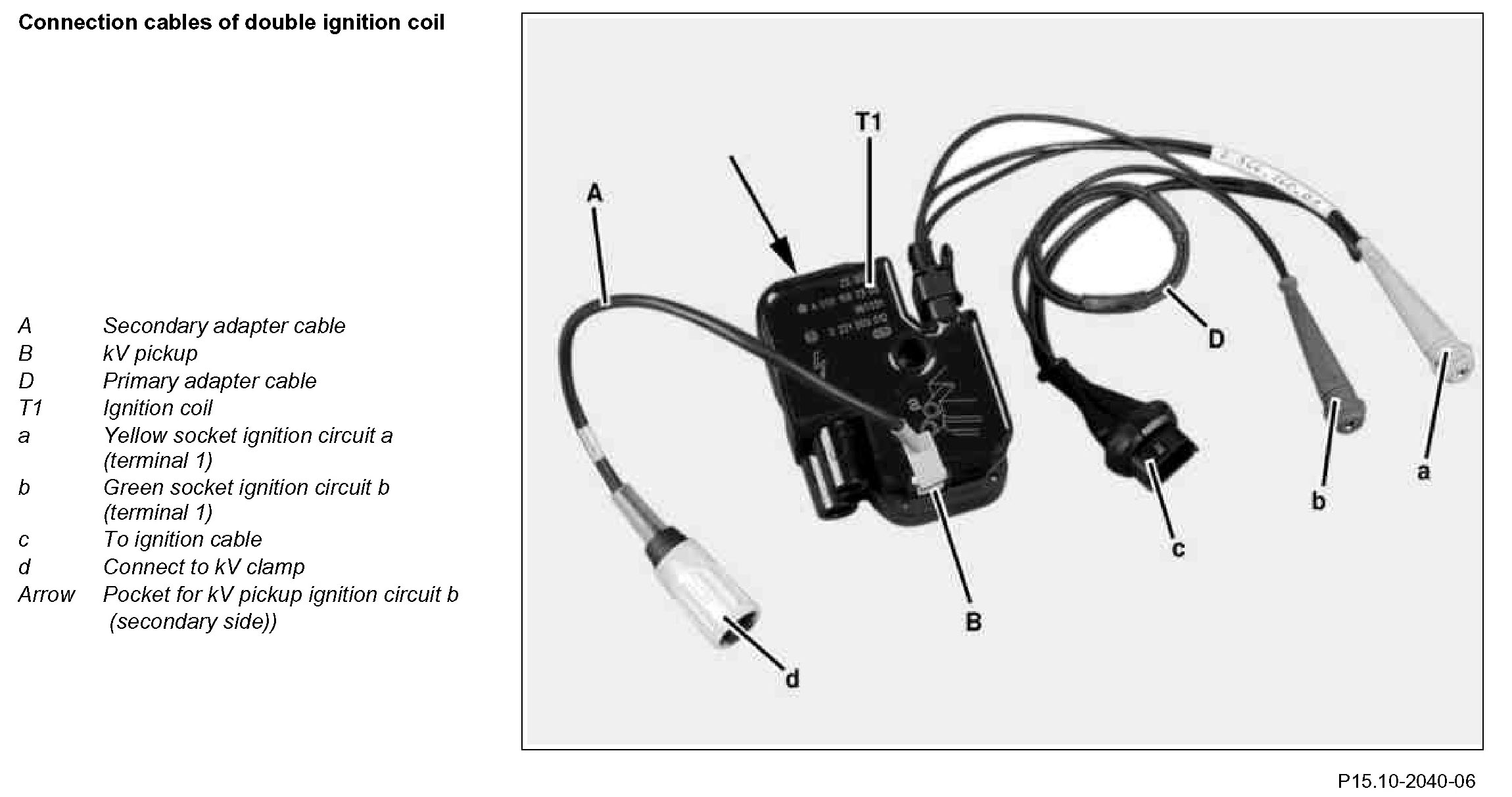The ignition system can be tested at the primary side and secondary side. It is only possible to test ignition circuit a and ignition circuit b one after the other.