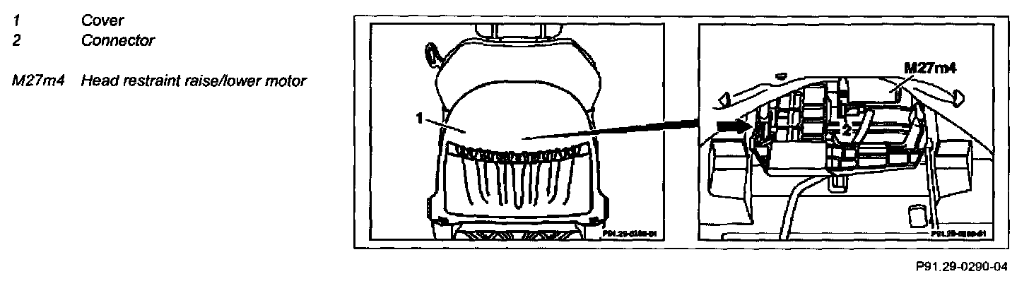 5 Press head restraint raise/lower motor (M27m4) to right (arrow) and remove downward
