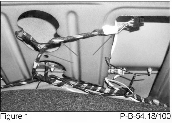 If you receive customer reports in the above model vehicles of the "summer opening feature" opening the windows, the trunk lid opening by itself or the TeleAid system repeatedly calling ATX regarding alarm activation, check the wiring harness starting at the connector for the emergency trunk opening button to where it joins the main harness. The edges of the sheet metal may make a small cut in the wire insulation which can occasionally short circuit to the trunk lid producing one of the above symptoms. This can be very hard to see but can be detected by carefully feeling along the wires with your fingers. To remedy, use cloth tape to protect the cuts in the wire harness and protect the remainder of harness (Figure 1, arrows) where it meets the edges of the underside of the trunk lid.