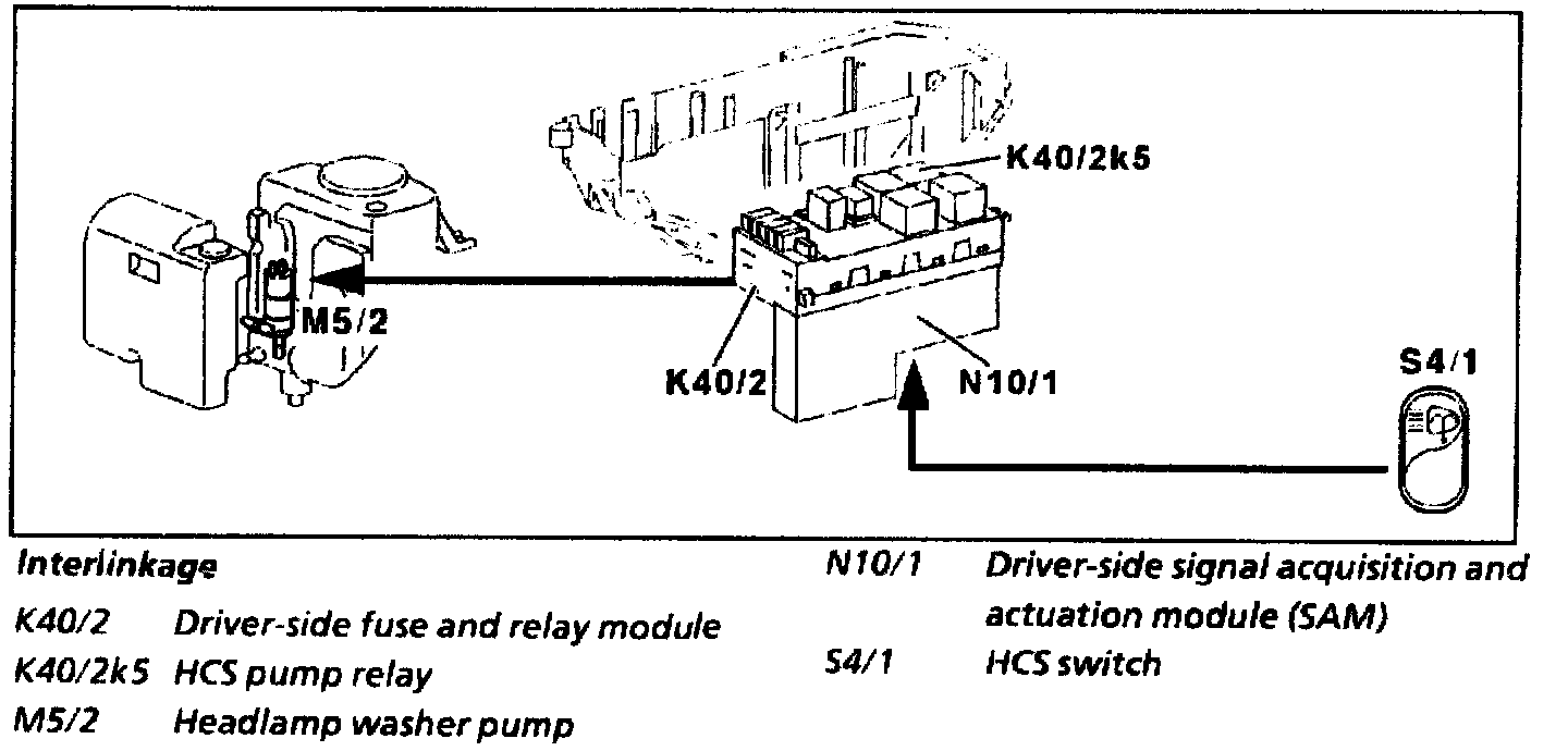 Function prerequisites: Circuit 15 switched on The headlamp cleaning system is activated by switch (S4/1), which switches a ground signal to the signal acquisition and actuation module when pressed. The driver-side signal acquisition and actuation module (N10/1) then actuates the HCS pump relay (K40/2k5) for approx. 1 s switching on the headlamp washer pump (M5/2). The pump builds up pressure in the washing water line. The telescopic nozzles extend and spray water on the headlamp lenses. As the pressure decreases the telescopic nozzles return to the retracted position. Pressing the switch (S4/1) continuously or repeatedly while the headlamp cleaning system is in operation does not start another washing operation.