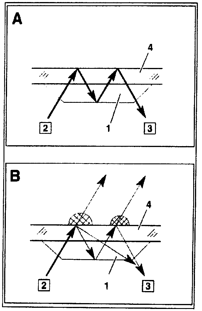 An infrared light beam is radiated by the infrared transmitter unit (2) and focused on the window (4) by the lens (1). If the window is dry in the area of the rain sensor (B38) the light is reflected almost completely (A). An IR receiver unit (3) is located at the other end of the lens which measures the percentage of light reflected. When the windshield in the area of the reflection surface is moist a portion of the light escapes from the glass (B). With increasing moisture the percentage of reflected light decreases The rain sensor measures this percentage and transmits the reading via the CAN bus on request. The rain sensor (B38) is connected to the overhead control panel control module (N70) by the CAN bus. The signal acquisition and actuation module (SAM) (N10/1) transmits a request to the rain sensor (B38) via the CAN bus and the rain sensor indicates to the SAM the momentary quantity of moisture each time a request is received.