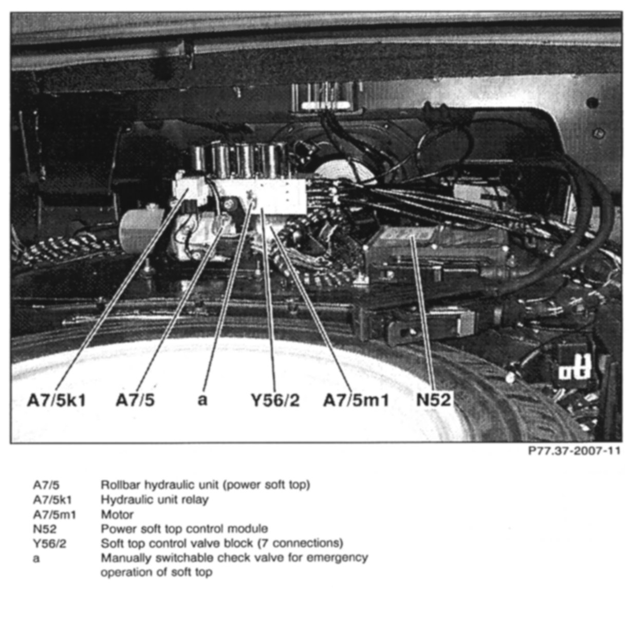 The valve screw (a), is to be closed again after emergency operation. Otherwise, the soft top could be moved manually Out of the soft top compartment by unauthorized persons. In addition, objects in the trunk would be fully accessible.