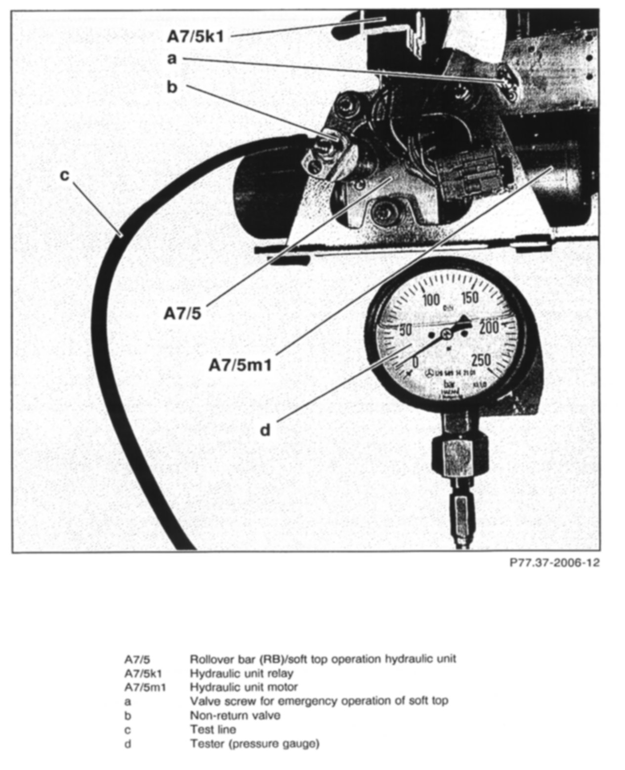 Connection of pressure gauge on the roll bar (RB) hydraulic unit (power soft top) (A7/5).