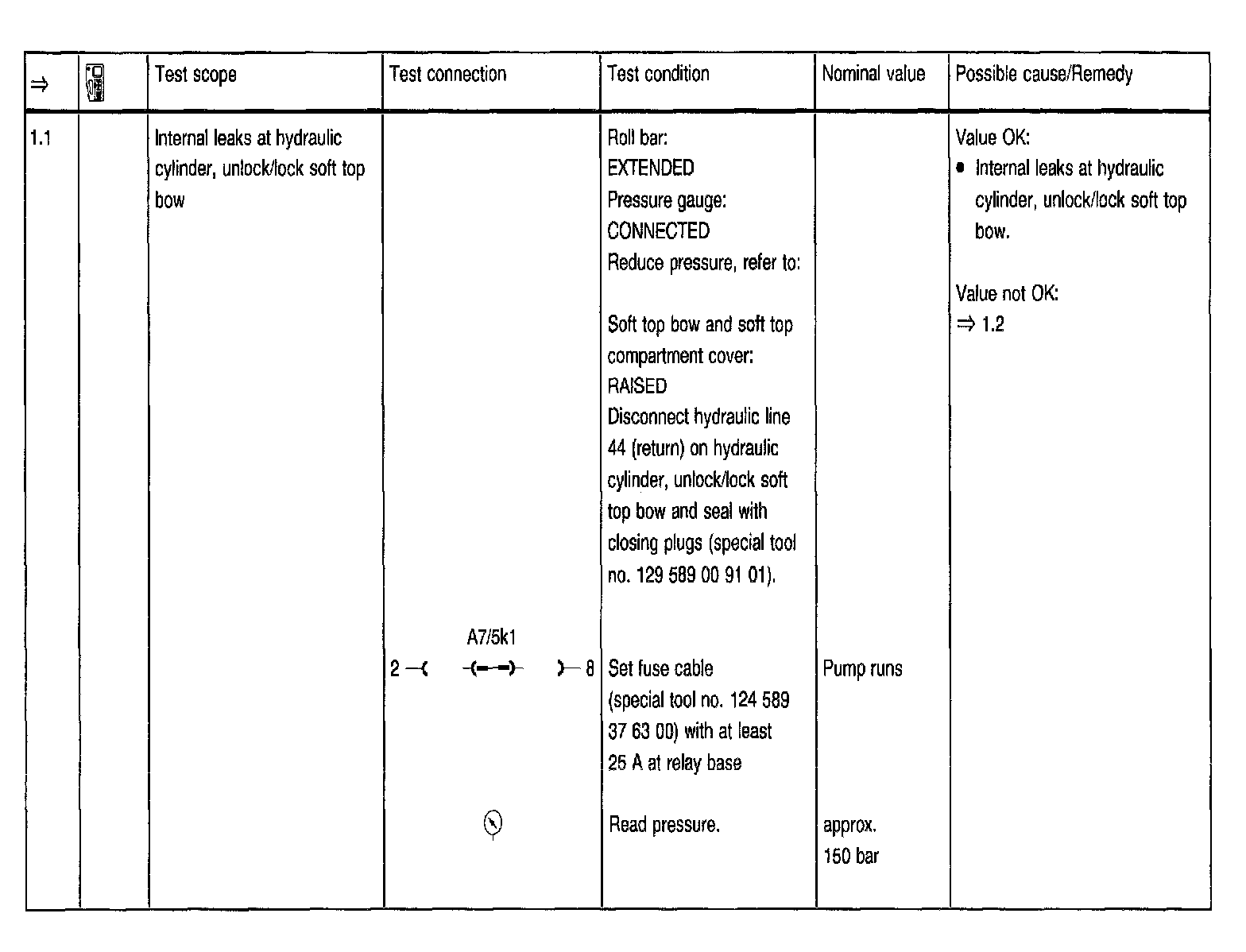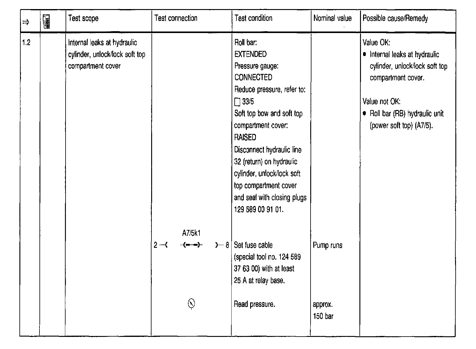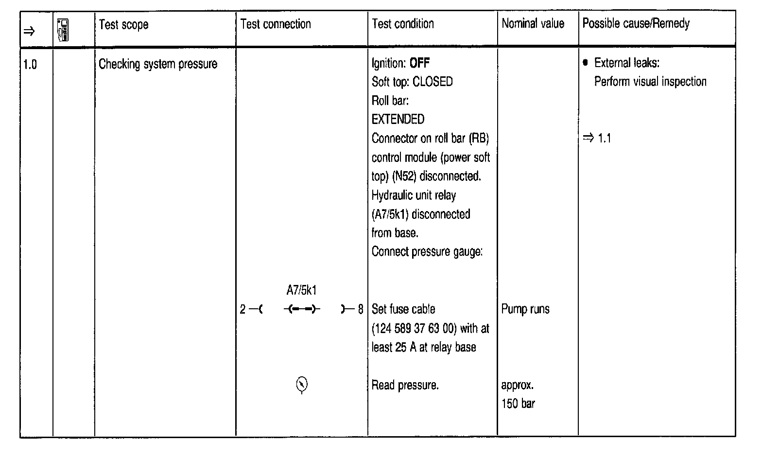 The pressure in the soft top/roll bar hydraulic system may still be present after taking a pressure measurement. There are 3 alternatives for reducing pressure before unscrewing the test line: