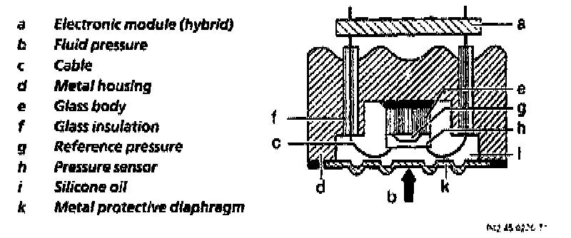 A sensor element compares the fluid pressure to be measured (b) in comparison with a reference pressure (g) in the sensor. The pressure (b) is transmitted to the actual sensor element (h) via a metal protective diaphragm (k) and a silicone oil layer (i). An electronic module (a) which transmits the pressure signal to the control module as an analog voltage, is located on the metal housing (d).