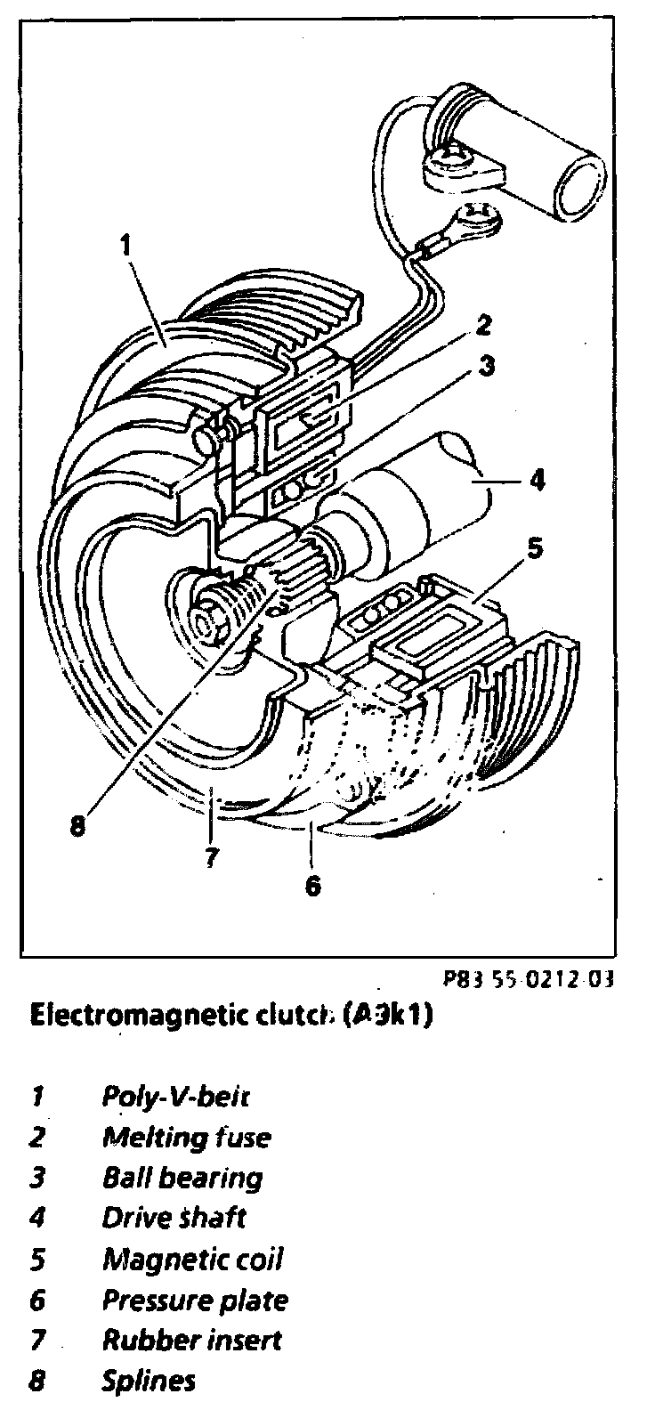 The pulley (1) on the A/C compressor drive shaft (4) is driven by a poly-V-belt. It turns on the ball bearing (3) around the magnetic coil (5) fastened to the A/C compressor housing. The pressure plate (6) with rubber insert (7) is connected to the A/C compressor drive shaft (4) by splines (8) allowing it to move in the axial direction.