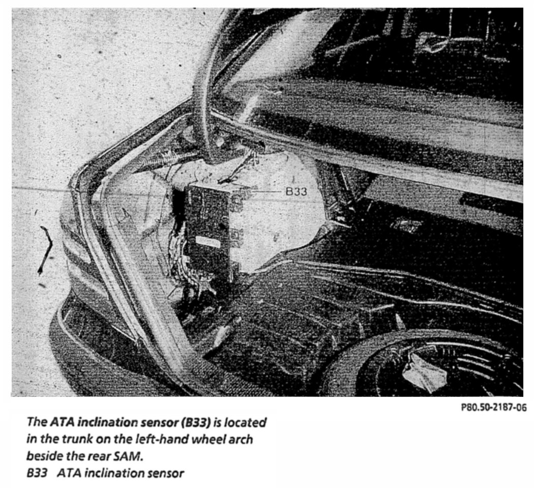 If the vehicle is then moved by a certain inclination in the longitudinal and / or transverse direction over a certain response time with the anti-theft alarm system (ATA) activated, then the ATA inclination sensor (B33) sends a signal to the rear SAM control module with fuse and relay module (N10/2)