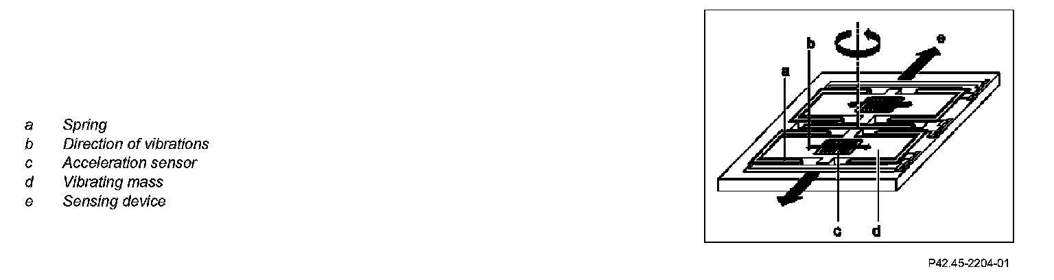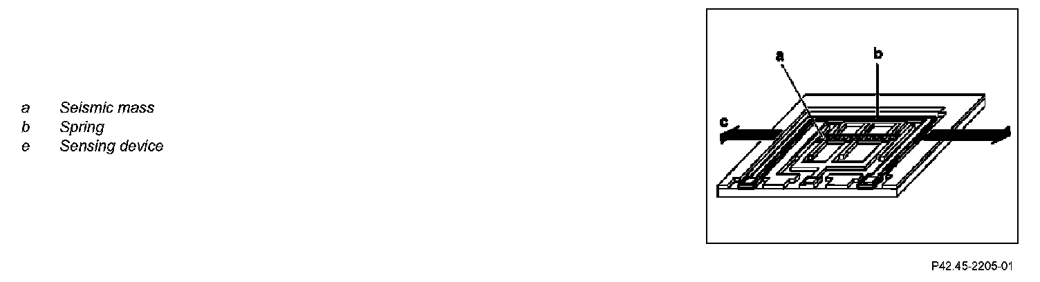The sensors for monitoring yaw rate and lateral acceleration are combined in the yaw and lateral acceleration sensor (B24/115) This reduces the component volume by approximately two thirds. The micro-mechanical sensory system converts the different accelerations of the vehicle around its vertical and lateral axle into signals which can be evaluated electronically by deflecting vibrating masses. signals suitable for assessment. The different types of masses are deflected differently according to the movement of the vehicle (cornering or decelerating).