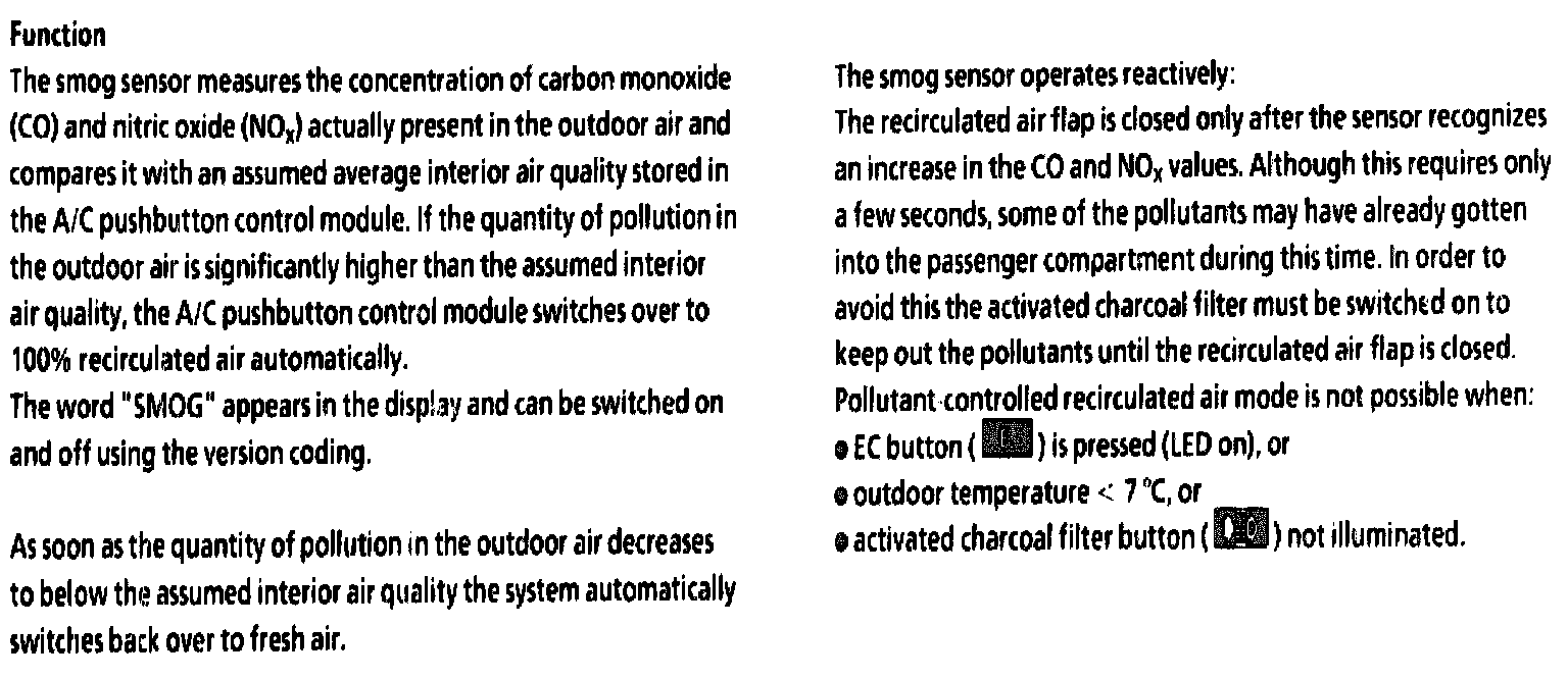The smog sensor switches to 100 % recirculated air via the push-button control module when the following conditions are fulfilled: