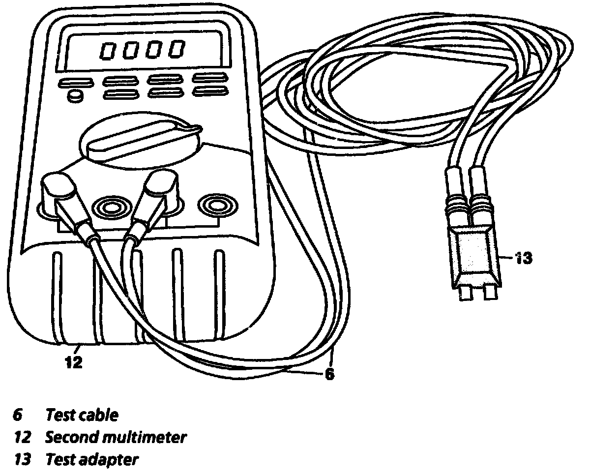 7 Connect test cable (6) and test adapter (13) to second multimeter (12) (amps DC mode).