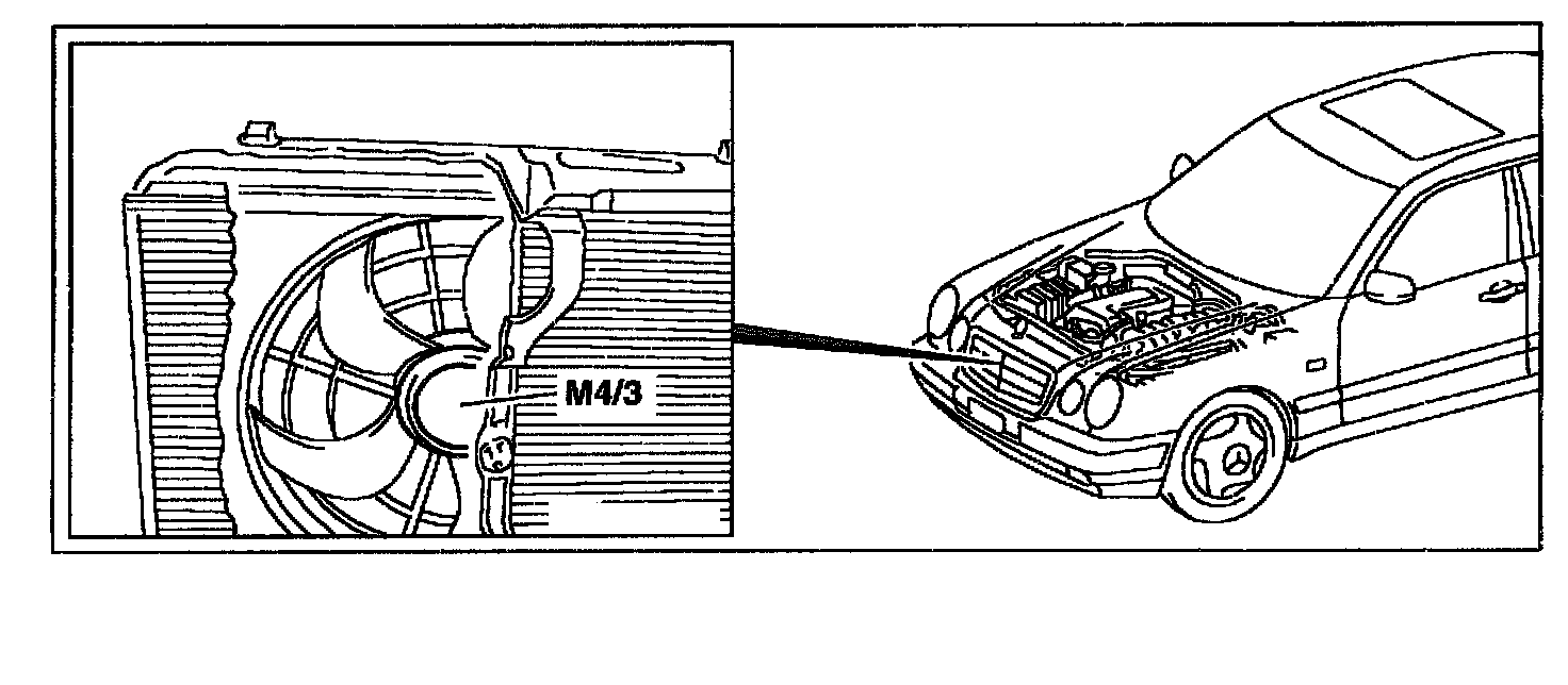 The electric suction-type fan (engine/A/C) (M4/3) is located behind the radiator grille.