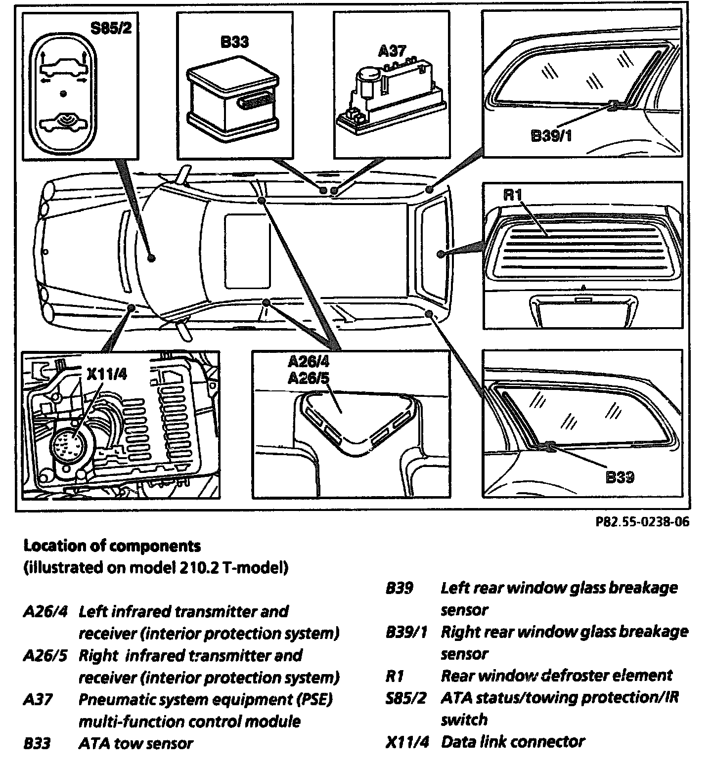 On the T-models glass breakage sensors (B39, B39/1) are vapor-coated onto the insides of the rear side windows. The rear window is protected by the rear window defroster element (R1) on model 210.2