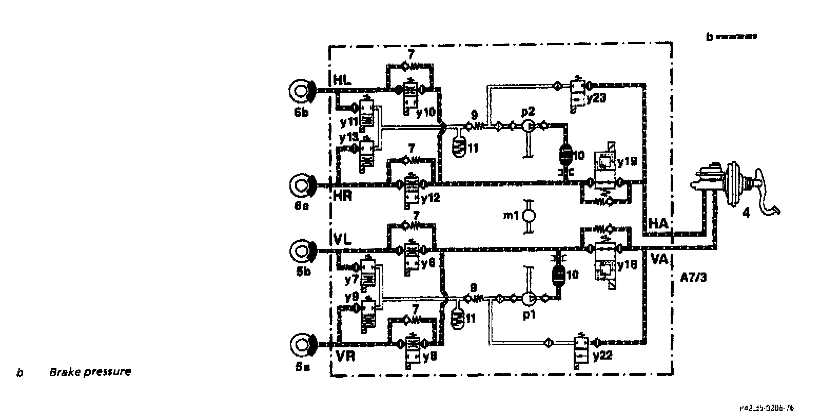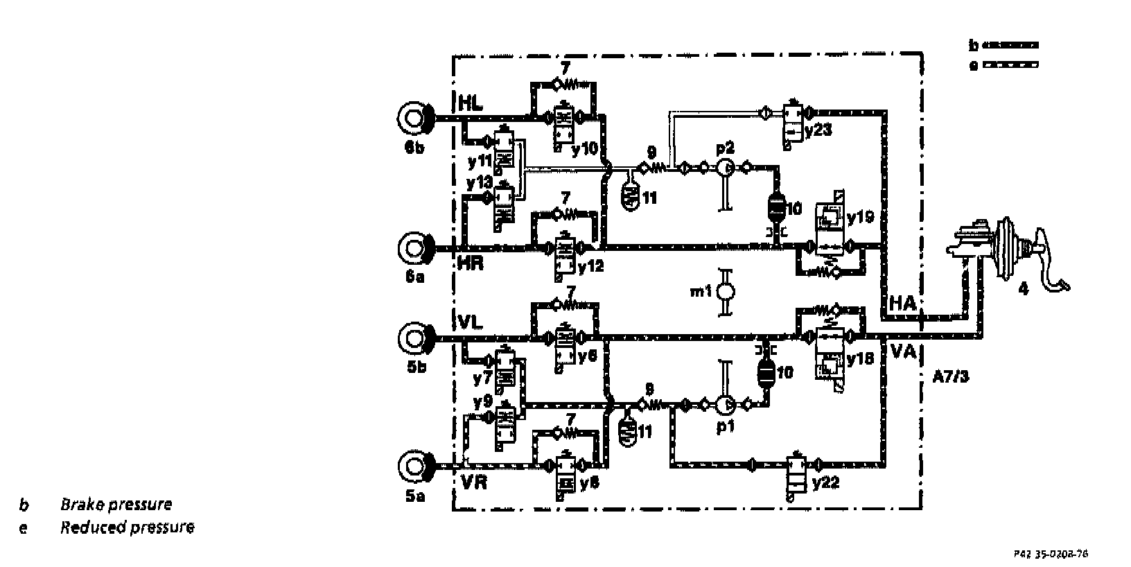 The brake pressure is first increased via the switchover solenoid valves (y18 and y19) and then at the front axle via the solenoid valves (y6 and y8) and at the rear axle via the solenoid valves (y10 and y12). The pressure is reduced via the same solenoid valve during a normal braking process.