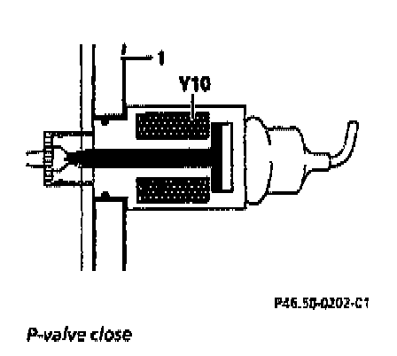 The P-valve is actuated in cycles with approx. 6V by the ETS, ASR or ESP control module (N47-1, N47-2, N47-5). As vehicle speed increases the current flow reduces and the P-valve opens the control restrictor continuously in accordance with a characteristic (K) defined in the control module. Consequently the oil flow is controlled and also the steering wheel torque.