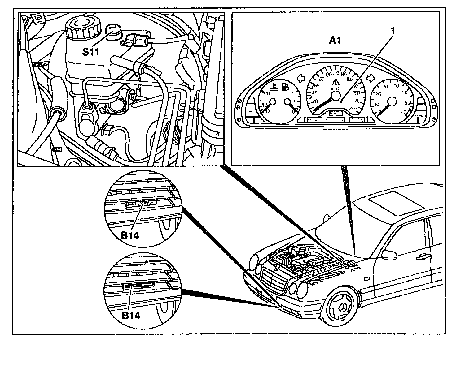 The outside air temperature sensor (B14) is located at the front left in the bumper.