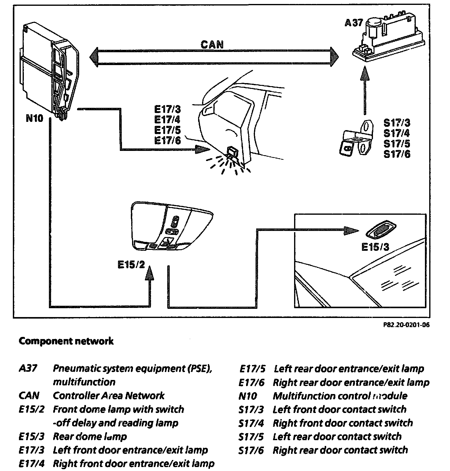 The door contact switch signal travels from the pneumatic system equipment (PSE) (A37) via the CAN data bus to the multifunction control module (N10). This control module controls the front dome lamp with reading lamp (E15/2) as well as the rear dome lamp (E15/3) and the entrance/exit lamps (E17/3, E17/4, E17/5, E17/6).