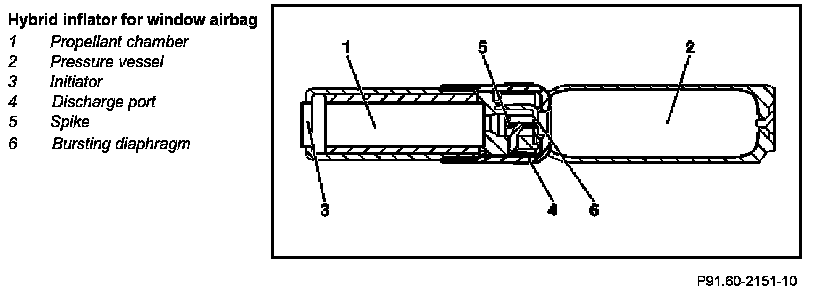 1. The restraint systems control module (N2/7) sends an ignition pulse to the initiator in the hybrid inflator.