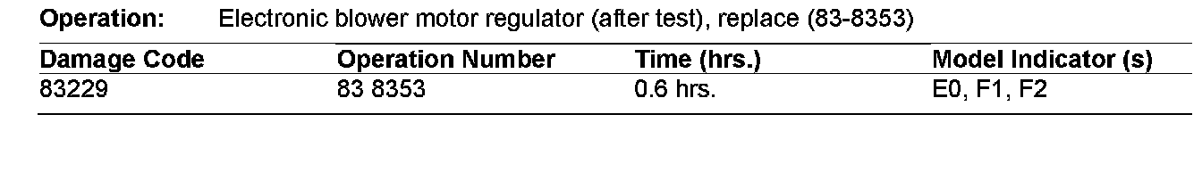 If you receive customer reports in the above models regarding poor or no operation of the air conditioning blower motor, trial install just the regulator before replacing the blower motor. Testing has found that in almost all cases when the blower motor is replaced together with the regulator, the blower motor is replaced unnecessarily. As of repair date October 27, 2003, all blower motors will be tested and if no fault is found, the blower will be returned and the claim will be debited.