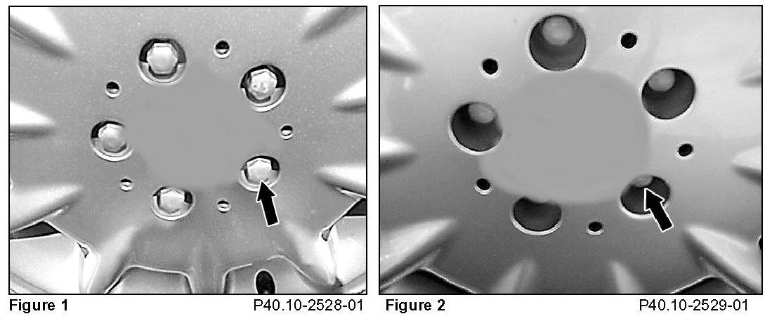 On models indicated above, as of February 2001 production, the longer wheel bolts (arrow, Figure 1) have been replaced with shorter wheel lug bolts (arrow, Figure 2).