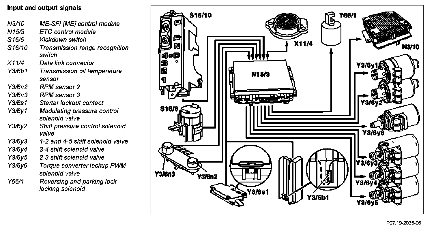 The ETC control module (N15/3) determines the instantaneous operating condition of the vehicle and controls all gearshift sequences taking into account the ease of shifting and the driving situation. This involves receiving, converting and transmitting various digital and analog signals.