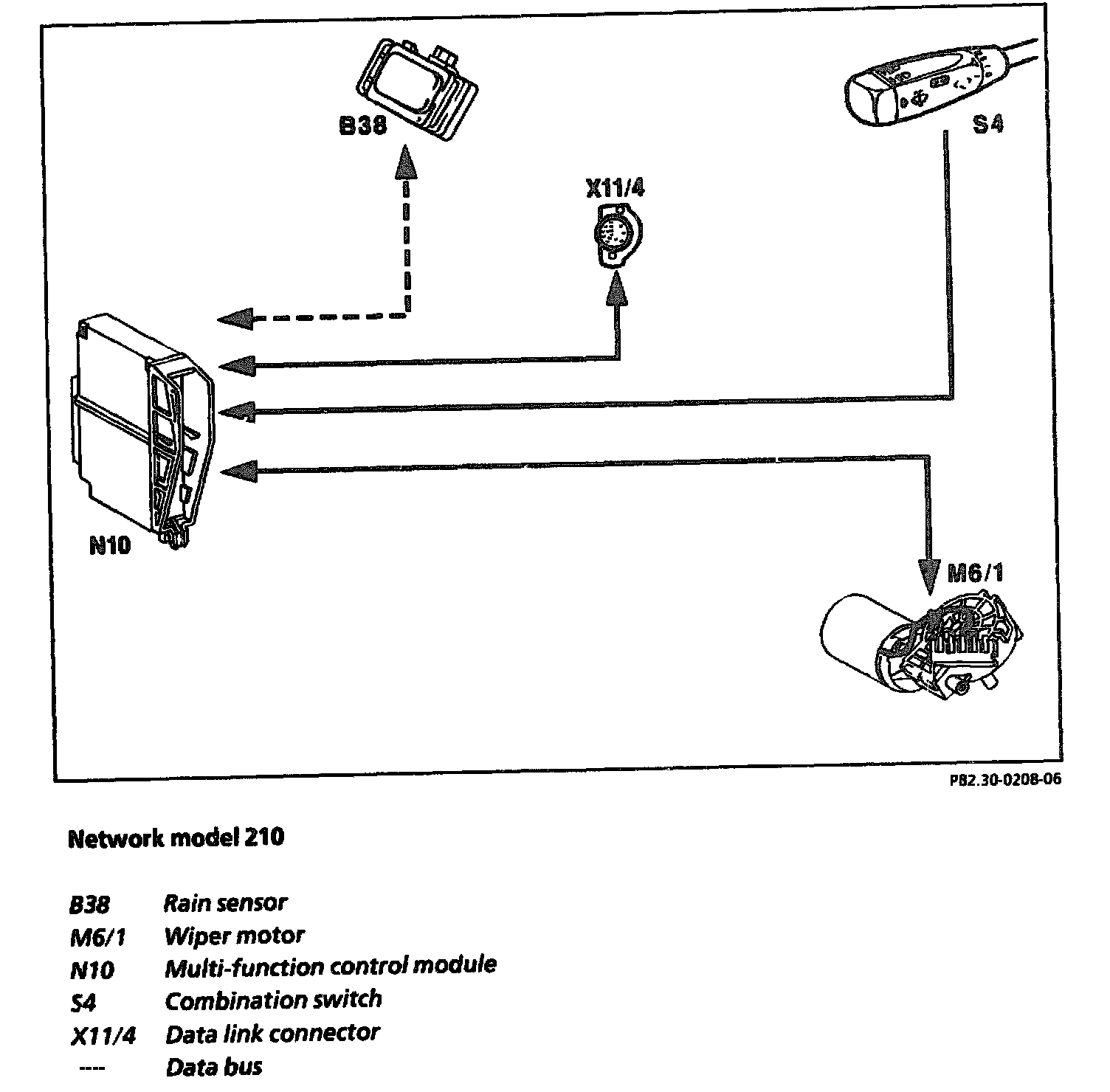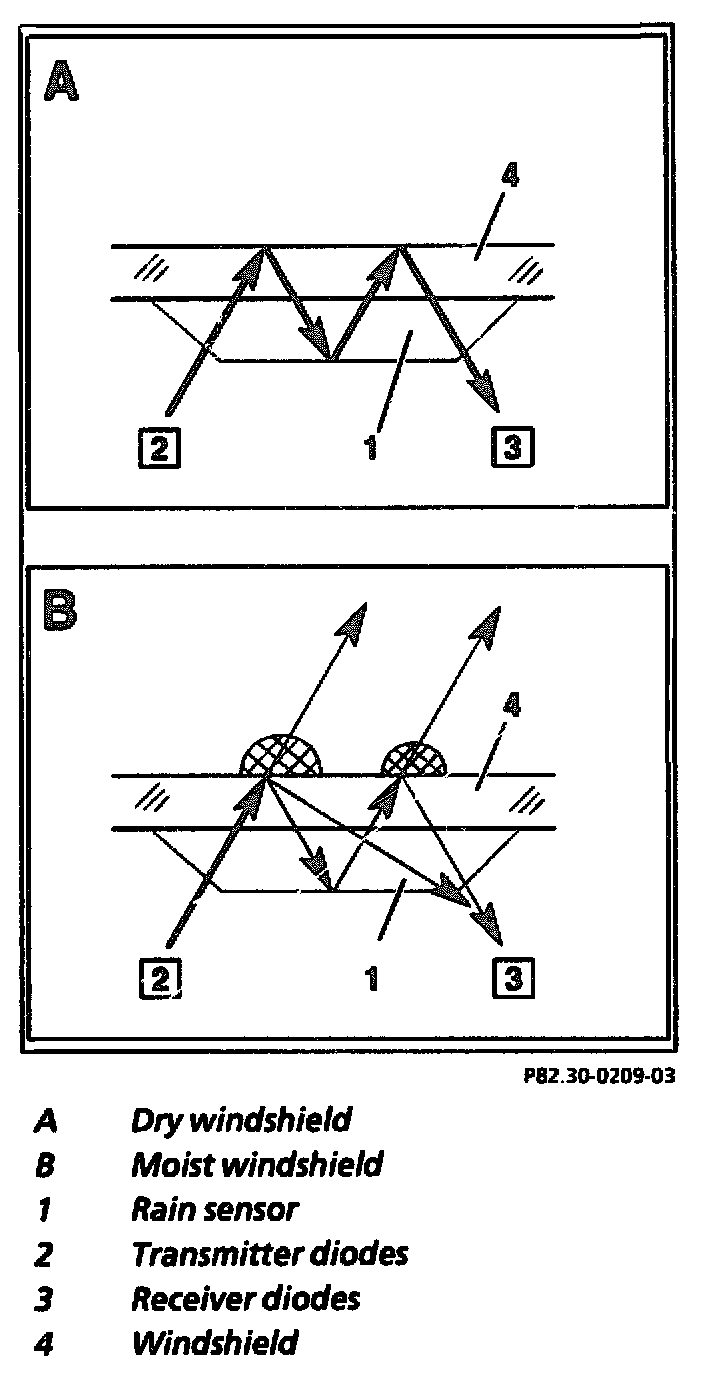 The rain sensor (B38) is connected to the multi-function control module (N10) or to the combination relay (N10/2) by a serial data bus. The multi-function control module (N10) or the combination relay (N10/2) sends a request to the rain sensor (B38) via the data bus. The rain sensor (B38) answers each request. The moisture on the windshield is measured by an optical element operating with infrared light. If the windshield in the area of the rain sensor (B38) is dry the light is reflected completely. If the windshield is wet in the area of the reflection surface the light is dispersed. The percentage of light reflected decreases as the moisture increases. This light reflection serves as the variable for control of the interval. If the rain sensor (B38) recognizes that the window is "moist", the multi-function control unit (N10) or the combination relay (N10/2) actuates the wiper motor (M6/1).