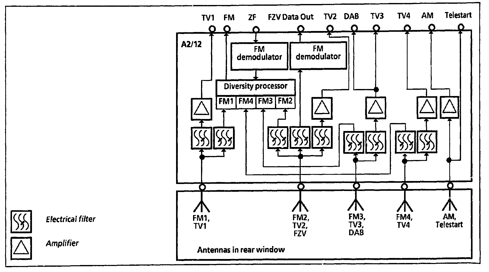 The following components are integrated into the rear window antenna amplifier module (A2/12) (see block diagram):