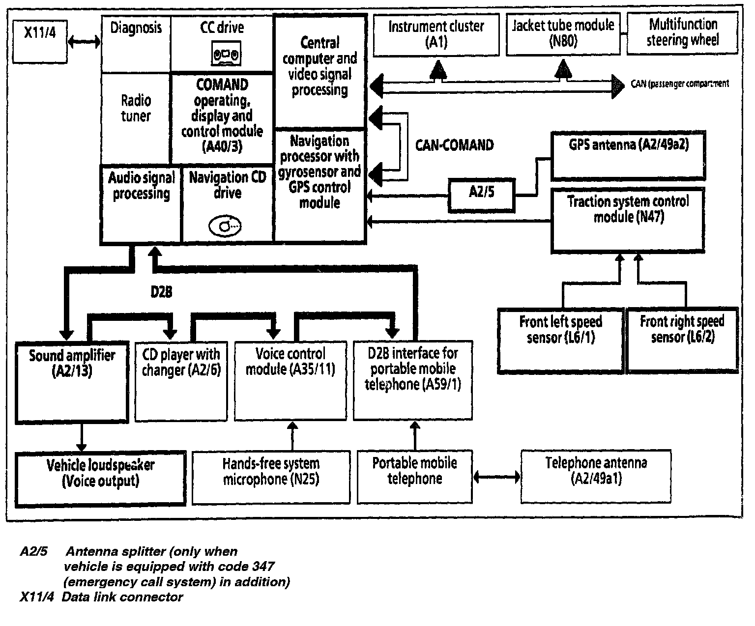 Block diagram, COMAND navigation system, illustrated with the following equipment: