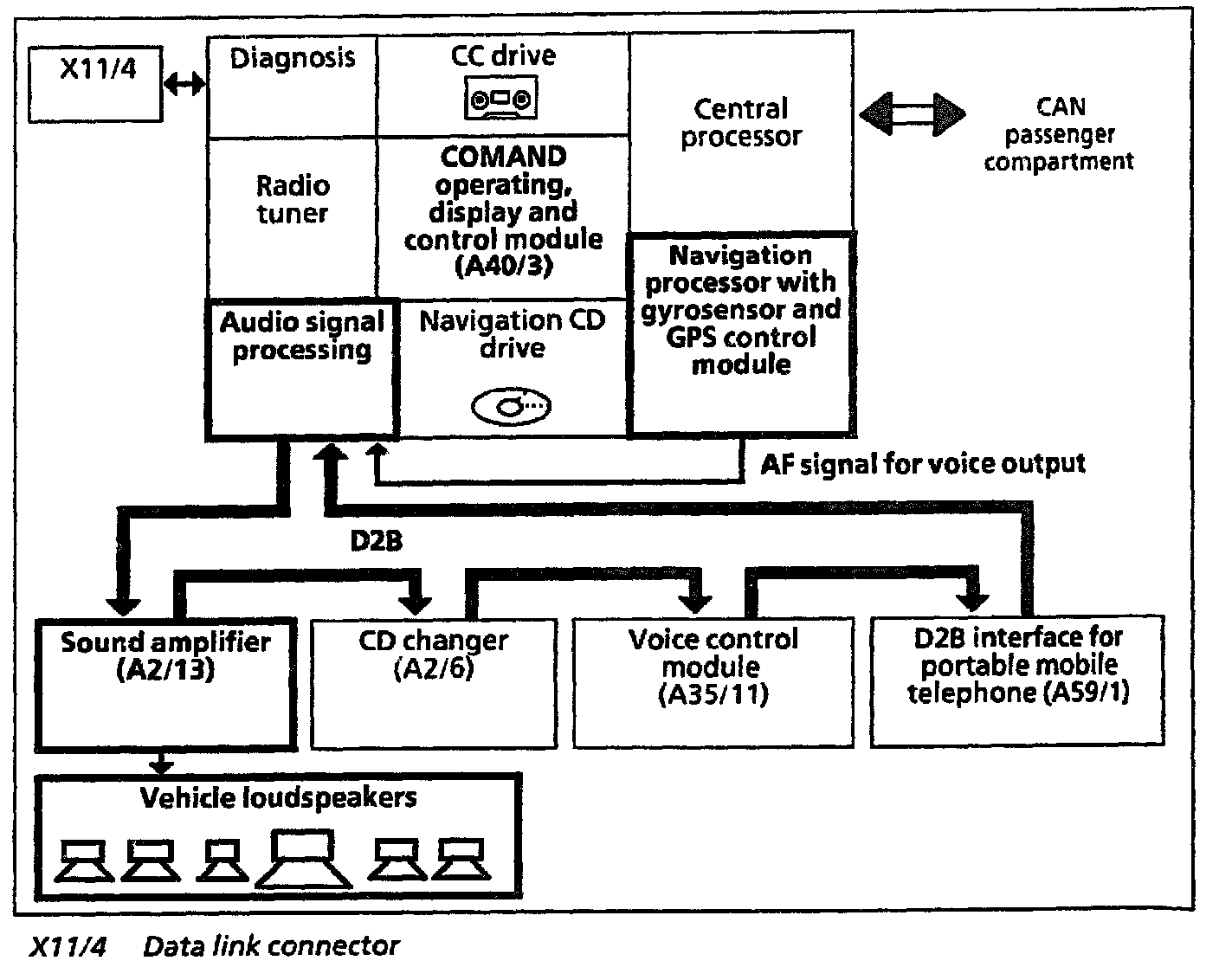 NOTE: If the vehicle is equipped with a sound system (code 810) (see block diagram) the voice signals are transferred to the D2B by the COMAND audio signal processing, and are received and amplified by the sound amplifier (A2/13) and output on the vehicle loudspeakers.