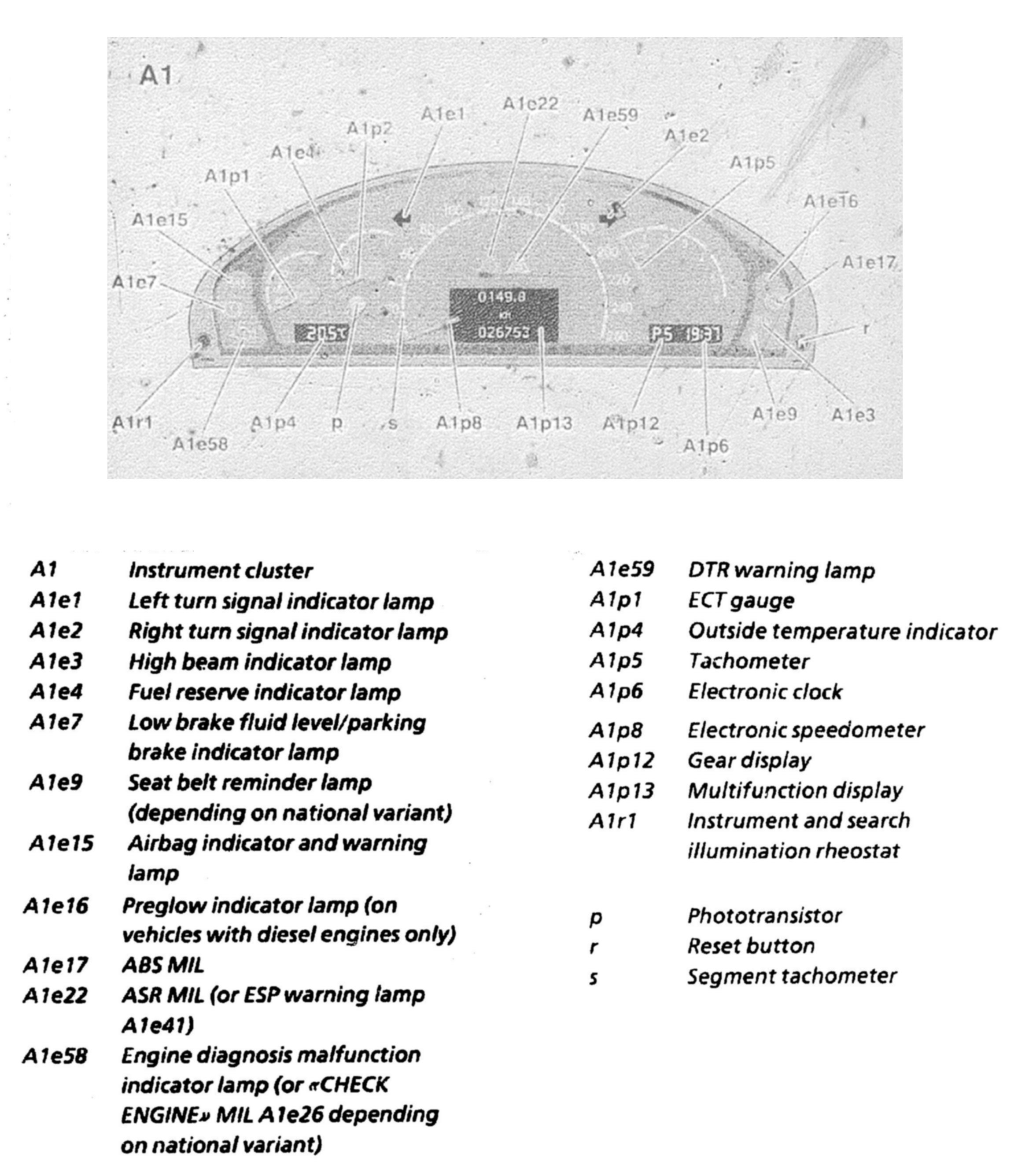With the instrument and search illumination rheostat (A1e1) the brightness of the illumination on the instrument panel (A1) as well as the search illumination and switch illumination can be adjusted to individual requirements.