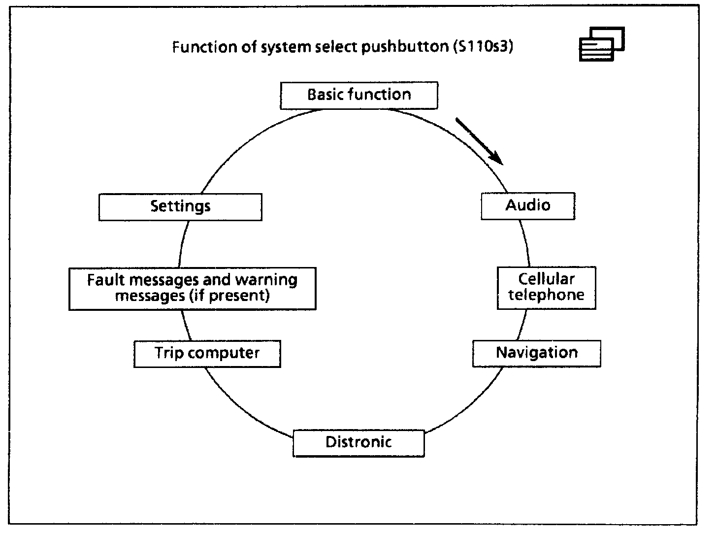 The multifunction display (A1p13) is changed over to the basic display of the next system or to the ((Settings...)) function by pressing the system select pushbutton (S110s3) of the multifunction steering wheel. (The length of time the button is pressed does not matter).