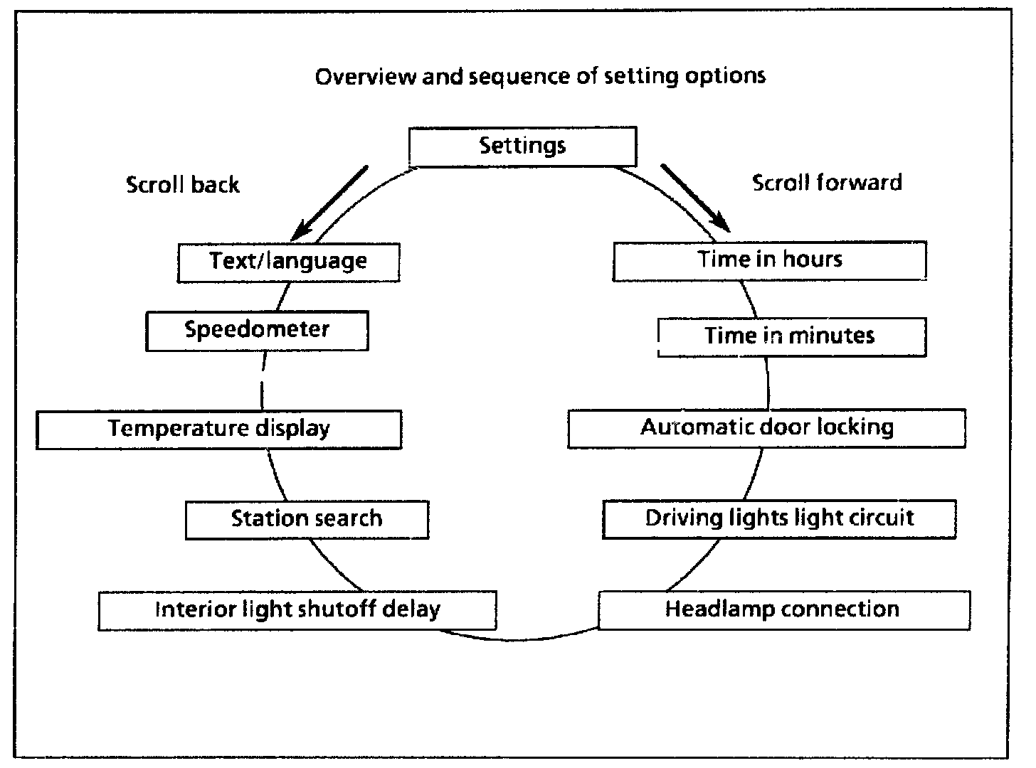 NOTE: Settings can only be made at vehicle speeds below 5 km/h. If the speed increases to over 10 km/h during the setting the display returns to the ((Settings)) basic display. The display only switches back to the previous display mask once the speed drops below 5 km/h again.